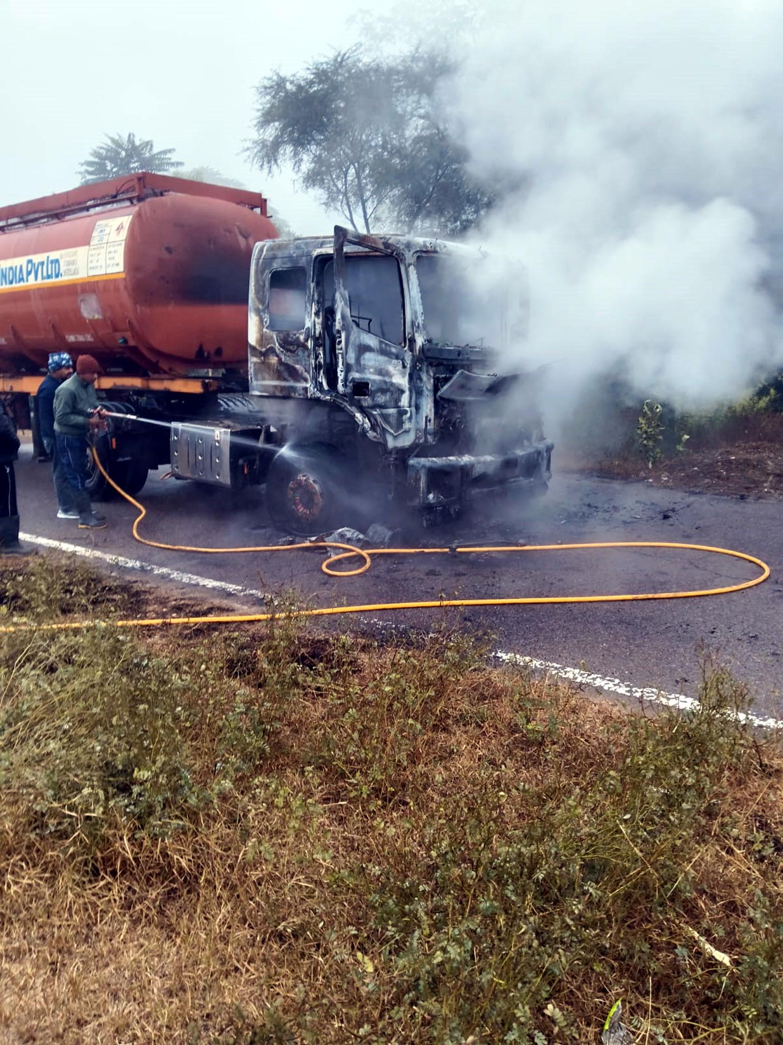फतेहाबाद : हाईवे पर ऑयल कंटेनर के केबिन में शार्ट सर्किट से लगी आग