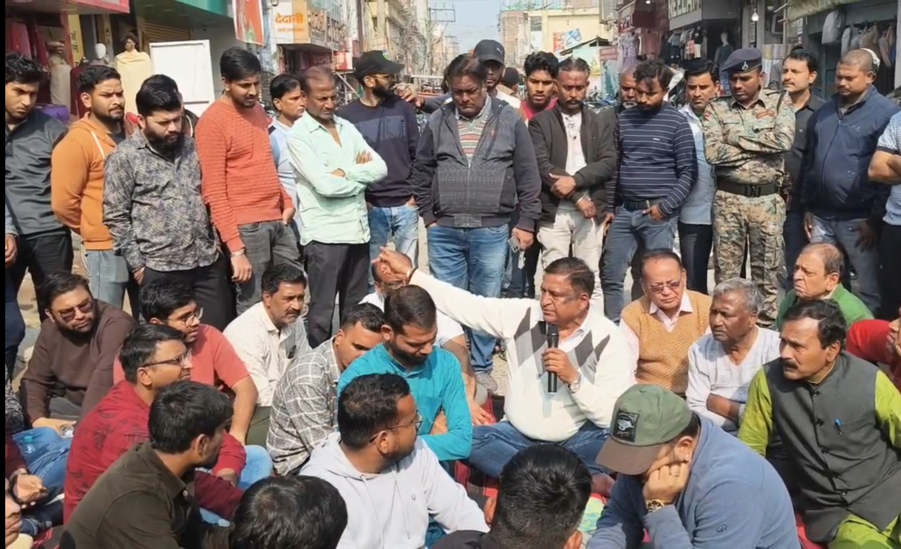 हादसे में कारोबारी के घायल होने पर व्यवसायियों का फूटा गुस्सा,सड़क पर बैठकर दिया धरना