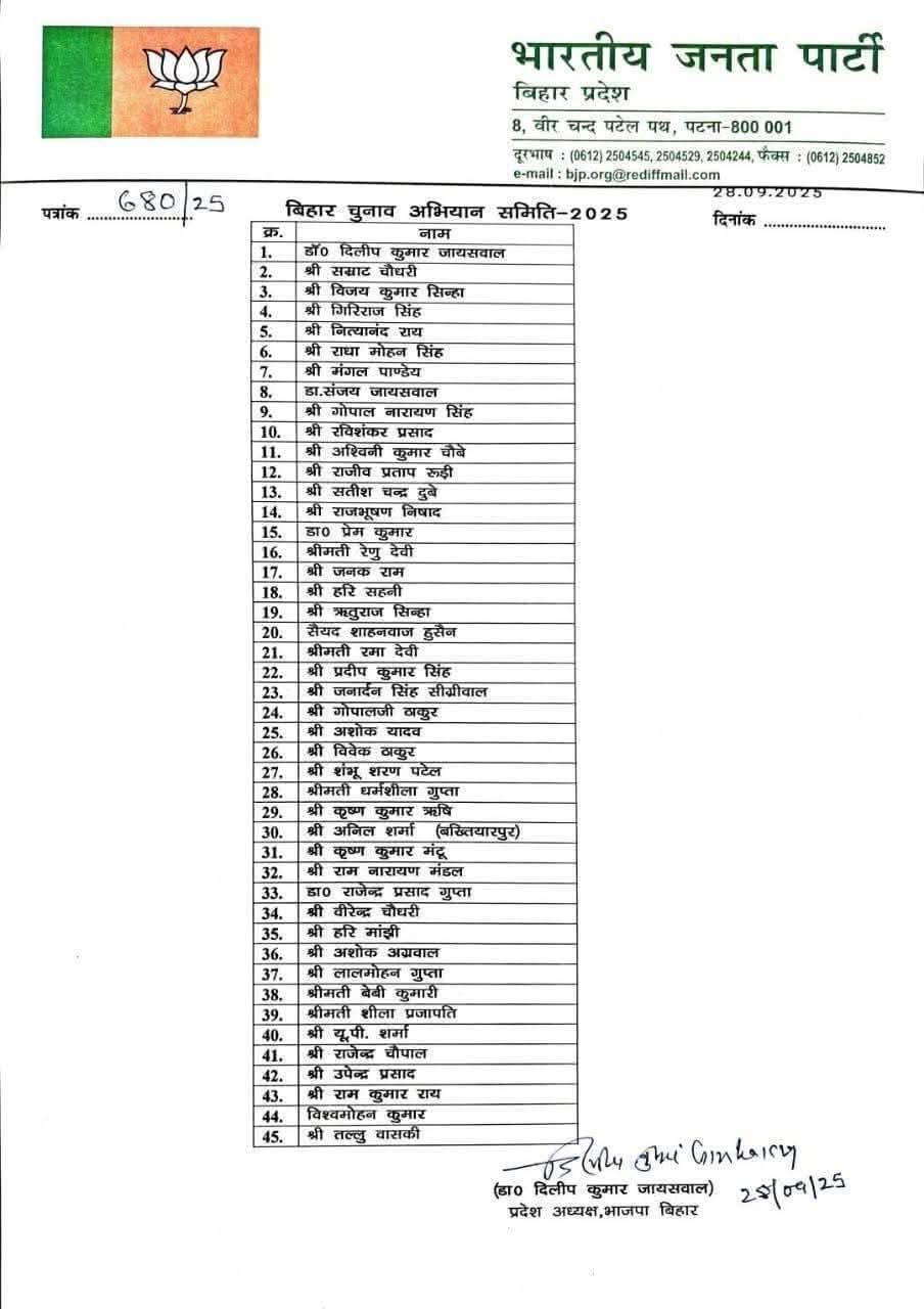 बिहार भाजपा ने की 45 सदस्यीय चुनाव अभियान समिति की घोषणा